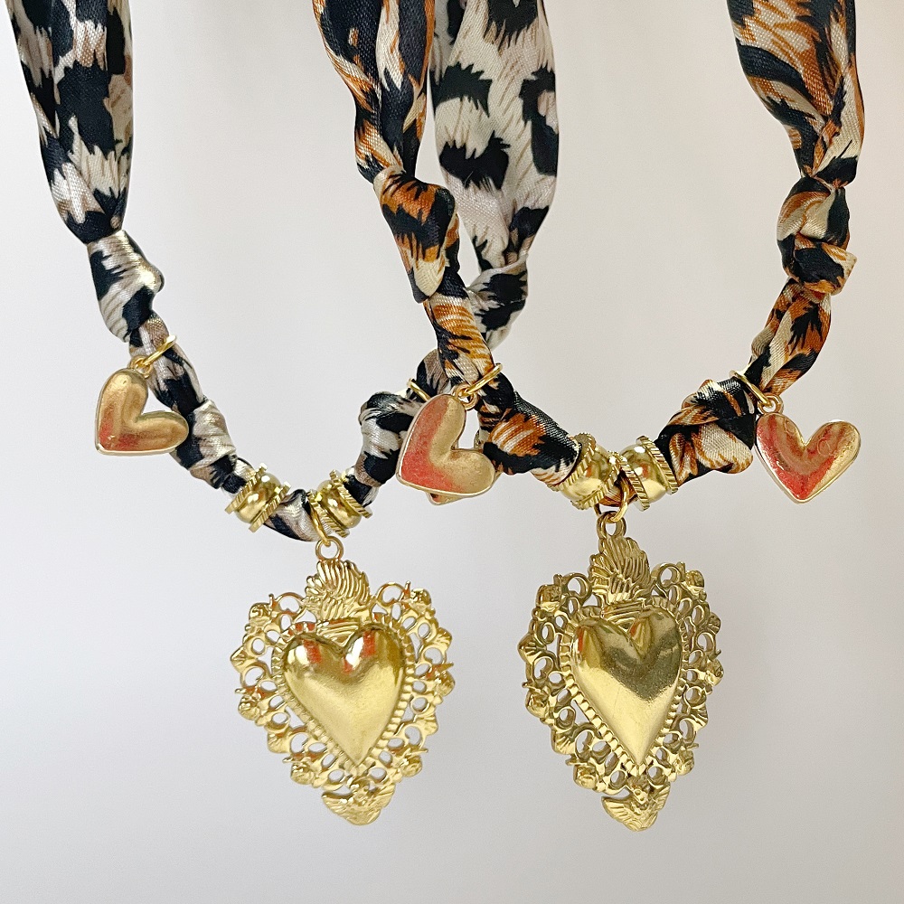 Women’s Fashion Bandana Scarf Necklace with Large Gold Heart Pendant, Leopard print bandana Necklace